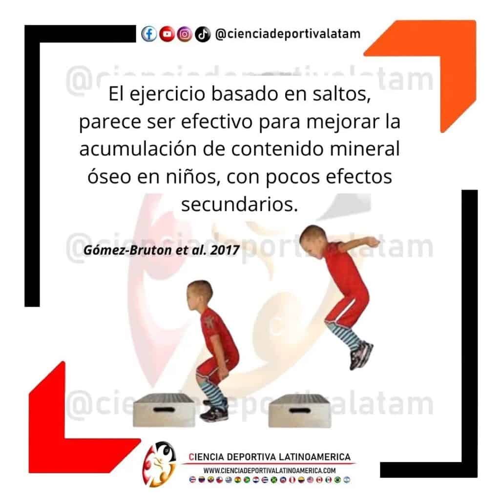 Una revisión sistemática concluyó que las intervenciones de ejercicio relacionadas con la aplicación de sesiones de entrenamiento de múltiples saltos y saltos pliométricos (salto desde bancos de diferentes alturas), dió como resultado un aumento a largo plazo del contenido mineral óseo y la densidad mineral ósea en niños prepúberes y púberes, con pocos o ningún efecto adverso (p.ej., daño o alteración en epífisis de crecimiento), maxime cuando la intervención fueron realizados en el entorno de la clase de educación física con una supervisión adecuada por el docente experto.