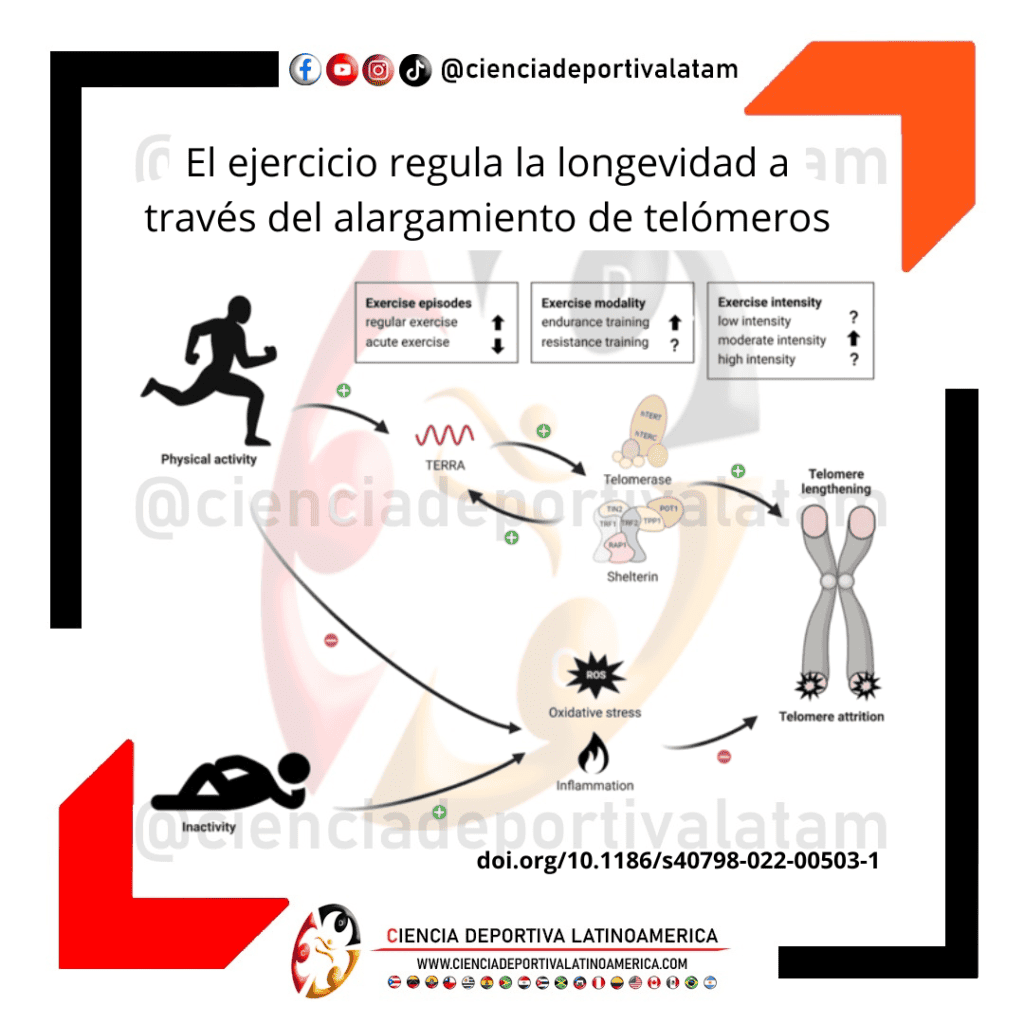 El ejercicio de resistencia de moderada intensidad, es la modalidad más investigada y vinculada con el mantenimiento de los telómeros. Sin embargo, falta evidencia acerca del impacto del entrenamiento de fuerza y de alta intensidad, para poder dilucidar sus contribuciones en la regulación telomérica.