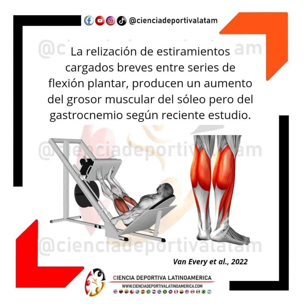 👉🏾 El entrenamiento se realizó 2 veces por semana, durante 8 semanas. Los resultados principales indicaron que la condición de estiramiento produjo un efecto modesto superior solamente en el grosor muscular del músculo sóleo y una tendencia a un mayor aumento de la fuerza isométrica máxima, en comparación con la condición tradicional (descanso pasivo entre series).