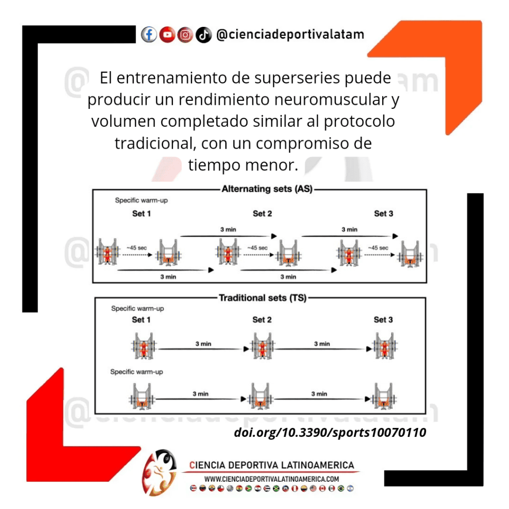 Hay que decir que aunque en general el rendimiento neuromuscular (velocidad de ejecución y repeticiones completadas) fue similar en ambas condiciones, en la condición superseries se completó un menor número de repeticiones en la última serie al fallo de sentadilla trasera, lo cual puede indicar algún deterioro del rendimiento probablemente por el emparejamiento de ejercicios.